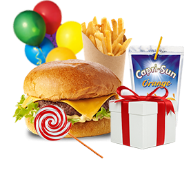 1 Burger + Frites + Capri-Sun + Jouet + Sucette + Ballon.